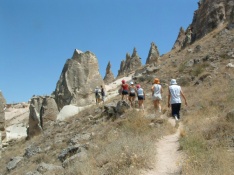 Am Vormittag erwartet Sie eine Wanderung durch das Rote Schlucht. Diese führt Sie durch Felsgalerien entlang ehemals bewohnter Höhlenwohnungen, welche Sie zum Teil noch besichtigen können. Vor dem Eingang zum Rosental beginnt der Aufstieg zur Hacli-Kirche. Die Wanderung von der Hacli-Kirche ins zweite Rosental ist besonders reizvoll, da der Weg über einen Bergrücken hoch über den Tälern führt. Im Tal angekommen, wandern Sie weiter bis nach Cavusin wo schon der Bus auf Sie wartet, um Sie nach Pasabag zu bringen. Hier nehmen Sie individuell Ihr Mittagessen ein. Das Pasabag-Tal beherbergt die höchsten und imposantesten Feenkamine Europas. Nach der Mittagspause fahren sie über Avanos nach Cavusin zurück, von wo Sie durch das Schwerter-Tal zum Freilichtmuseum von Göreme (UNESO-Weltkulturerbe) wandern. Hier besichtigen Sie die historische Klosteranlage, in welcher mehrere in den Tuffstein ausgeschlagene Kirchen zu bewundern sind, die von Mönchen sehr schön bemalt wurden. Sie fahren zum Hotel zurück.