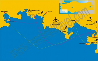 After Breakfast, about 3 hour our yacht we will arrive in Gocek. Gocek is famous for its green pine forests and thousands of olive trees. Then we head to our yacht, the Hamam (Cleopatra) Bay, where there is some water in the sunken ruins. The locals claim it is here at the Baths of Cleopatra. In the afternoon we trekking around the Bay. (Time: 2,5 Hour. +/- 50 m Trekking: 6 km)